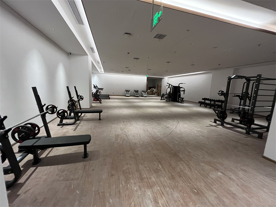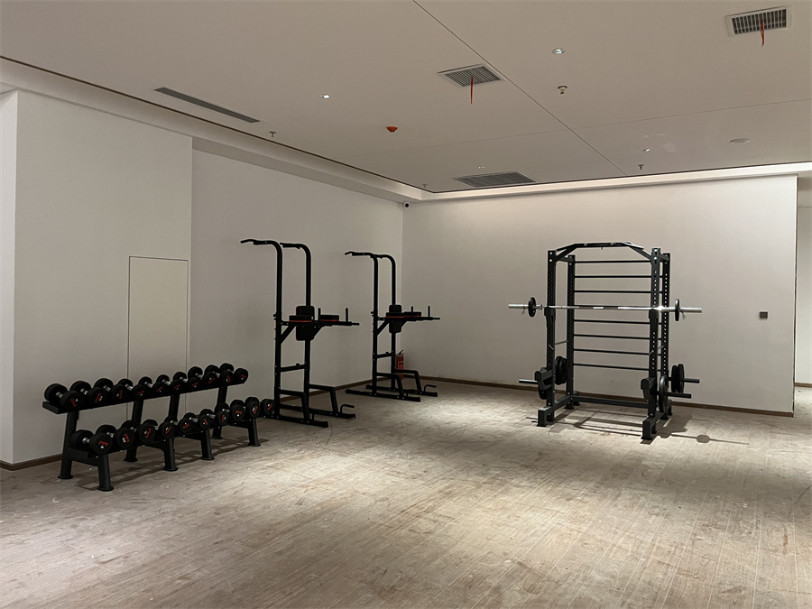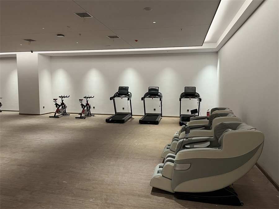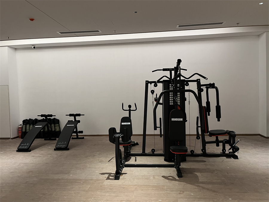 配置方案:该单位健身房主要以健身和休闲为主,增强职工身体素质,丰富业余生活,配置主要以悍德森有氧器械和力量器械相结合:有跑步机、动感单车、五人站综合训练器、史密斯、单双杠、哑铃、按摩椅等健身设备。